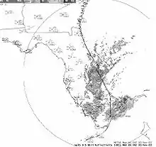 On November 1, convection increased in the complex system that absorbed the remnants of Nicholas, and the National Hurricane Center indicated the system could develop into a tropical or subtropical cyclone at any time.[13] The low continued quickly westward, generating only sporadic convection, and crossed Florida on November 3. After entering the Gulf of Mexico, it turned to the west-northwest,[1] and without organizing it made landfall in southeast Louisiana on November 4.[14] It continued inland, and quickly weakened over Louisiana and Mississippi on November 5.[15]