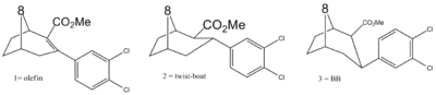 It had been hypothesized that transporter binding of the tropanes might include ionic bonding of the central tropane nitrogen. But it turned out that at this site neither ionic nor hydrogen bonding is a prerequisite for potent monoamine reuptake inhibition. Oxa- and thia-analogs of RTI-111 are potent inhibitors, and even an N-replacement by methylene holds the potency within the same magnitude.[6][7][8] However, N-quaternisation (N-dimethyl) considerably reduces DAT affinity.