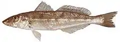 The common name of the species, trumpeter whiting, refers to the grunting sound the fish makes when first taken from the water,[2] with a number of other species of unrelated fish also known to do this. The names 'winter' and 'diver' whiting are in reference to the high catches made in winter by amateur fishermen and the depth at which larger individuals of the species inhabit respectively.[2]