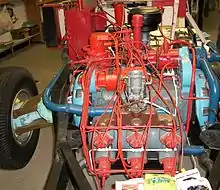 Tucker initially tried to develop an innovative engine, with help from Ben Parsons, then owner and president of the Fuelcharger Corporation, and would later be Tucker's VP of engineering.[19] It was a 589 cubic inches (9.65 L) flat-6 cylinder with hemispherical combustion chambers, fuel injection, and overhead valves operated by oil pressure rather than a camshaft. An oil pressure distributor was mounted in line with the ignition distributor and delivered appropriately timed direct oil pressure to open each valve at proper intervals. The oil pressure fed to each valve was "timed" by intake and exhaust eccentrics and measured by spring-loaded plungers.[19] It had large pistons built of aluminum and magnesium castings with steel-plated cylinder linings.[19] This unique engine was designed to idle at 100 rpm and cruise at 250-1200 rpm through the use of direct-drive torque converters on each driving wheel instead of a transmission. It was designed to produce almost 200 hp (150 kW; 200 PS)1 and 450 lb⋅ft (610 N⋅m) of torque at only 1800 RPM. When cruising at 60 mph (97 km/h), it would only turn at approximately 1000 rpm.[19] These features would have been auto industry firsts in 1948, but as engine development proceeded, problems appeared. Six prototypes of the 589 engine were built, but it was installed only in the test chassis and the first prototype.[15]