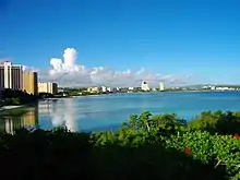 Tumon (Chamorro: Tomhom) is a district located on Tumon Bay along the northwest coast of the United States unincorporated territory of Guam. Located in the municipality of Tamuning, it is the center of Guam's tourist industry.