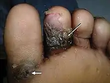 In severe cases, ulcers are common, as well as complete tissue and nail deformation. A patient may be unable to walk due to severe pain if too many of the lesions are present in the feet. Suppuration (pus formation), tissue death, auto-amputation of digits (via ainhum), and chronic lymphedema may also be seen.[4]