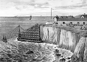 The cliffs just north of the Tunitas Creek outflow were the site of "Gordon's Chute", a ramp for sliding farm goods from the top of the cliffs to ships anchored in the rolling surf below. Gordon's Chute, named for its builder, local resident Alexander Gordon, was constructed in 1872 and lasted until 1885, when a storm blew it away.[7] Eyebolts for the chute can still be found in the cliff-face.[7]