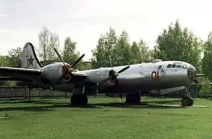 The Tupolev Tu-4 (Russian: Туполев Ту-4; NATO reporting name: Bull) is a piston-engined Soviet strategic bomber that served the Soviet Air Force from the late 1940s to mid-1960s. It was an unlicensed, reverse-engineered copy of the American Boeing B-29 Superfortress.