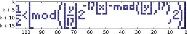 The formula is a general-purpose method of decoding a bitmap stored in the constant , and it could be used to draw any other image. When applied to the unbounded positive range , the formula tiles a vertical swath of the plane with a pattern that contains all possible 17-pixel-tall bitmaps. One horizontal slice of that infinite bitmap depicts the drawing formula itself, but this is not remarkable, since other slices depict all other possible formulae that might fit in a 17-pixel-tall bitmap. Tupper has created extended versions of his original formula that rule out all but one slice.[4]