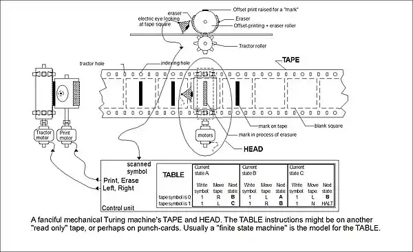 The Turing machine shown here consists of a special paper tape that can be erased as well as written with a "tally mark". Perhaps the TABLE is made out of a similar "read only" paper tape reader, or perhaps it reads punched cards. Turing's biographer Andrew Hodges (1983) has written that Turing as a child liked typewriters. A "'miraculous machine' -- a mechanical process which could work on Hilbert's decision problem" (Hodges p. 98) had been suggested by G. H. Hardy, one of Turing's teachers. Nevertheless, "His machine had no obvious model in anything that existed in 1936, except in general terms of the new electrical industries, with their teleprinters, television 'scanning', and automatic telephone exchange connections. It was his own invention." (Hodges p. 109)