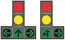 In Slovenia, the same sign as in Germany is used,[48] where vehicles can turn right on a red light at all times, but they don’t have the right of way. Some intersections also have a green arrow light, that is lit when right turns are allowed.[49][50] Historically, a different sign with the same meaning was used in the nineteen sixties, a green curved arrow on a small white rectangle board, attached under a traffic light.[51][52]