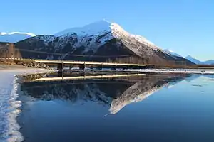 ![]() Twentymile River at its delta at the Seward Highway bridge. (Portage Peak in the background) | |