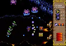 Some of the levels featured are linear in nature, populated with obstacles and enemies, involving the player to traverse the stage by running, shooting and dodging enemies, while other levels that are featured early and later in the game features various paths to choose from, making the player to take any routes to reach the end, which encourages exploration in order to find items hidden in treasure chests such as star-marked orbs that increases Saria's current magic attack in use up to three times, which decreases after taking an enemy hit, two types of magic bombs that alters between each other when not picked up and vials that restores the player's health.[8] However, when picking up any of these items when fully powered up will increase the magic attacks that are not currently used, swap the stocked magic bombs and grant extra points respectively.