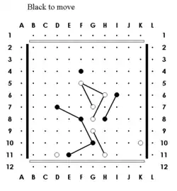 Mark Thompson's variant Diagonal TwixT has the same rules as standard TwixT, but the border lines run at a 45-degree angle to the grid.[5] David Bush's version has the border lines running parallel to link paths. These variants result in different tactical patterns.