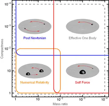 Einstein's equations can also be solved on a computer using sophisticated numerical methods.[1][2][3] Given sufficient computer power, such solutions can be more accurate than post-Newtonian solutions. However, such calculations are demanding because the equations must generally be solved in a four-dimensional space. Nevertheless, beginning in the late 1990s, it became possible to solve difficult problems such as the merger of two black holes, which is a very difficult version of the Kepler problem in general relativity.