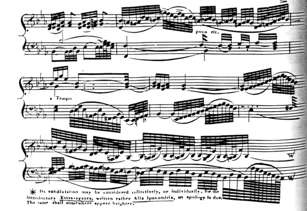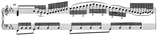 =100; every note in a piece may be notated as twice as long but last the same amount of time if the tempo is also doubled. They are principally used for brief, rapid sections in slow movements. For example, they occur in some editions of the second movement (Largo) of Beethoven's Third Piano Concerto (Op. 37) (1800), to notate rapid scales.[3] Another example is in Mozart's Variations on "Je suis Lindor" (1778), where four of them are used in the slow (molto adagio) eleventh variation.[4][5] A further example occurs (Grave.Adagio non troppo) in Jan Ladislav Dussek's (1760–1812) Fifth Piano Sonata, Op. 10 No. 2.[6] They also occur (Largo) in Vivaldi's (1678–1741) Concerto, RV 444,[3][7] and in bar 15 of François Couperin's Second Prelude from L'art de toucher le clavecin (1716).[8]