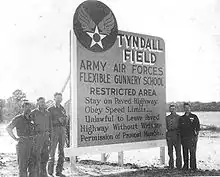 Tyndall Field first opened its doors on December 7 1941 as a gunnery range.[3] The airfield was named in honor of 1st Lt Frank Benjamin Tyndall (1894–1930).[4] With the establishment of the United States Air Force in 1947, the facility was renamed "Tyndall Air Force Base" on 13 January 1948. In December 1940, a site board determined that Flexible Gunnery School No. 9 would be located 12 miles (19 km) southeast of Panama City, Florida on East Peninsula. On 6 May 1941, U.S. Army and local dignitaries held an official ground breaking for the school. Panama City's mayor, Harry Fannin, dug the first spade full of sand, and Colonel Warren Maxwell, Tyndall's first commander, wielded the first ax on the stubborn palmetto plants, so common on the East Peninsula. The site was covered with pine and palmetto trees, scrub brush, and swamps. Bulldozers worked around the clock to clear the brush and fill in swamps.[5] The base also subsumed the settlements of Cromanton, San Blas, Redfish Point, Auburn and Farmdale.[6]