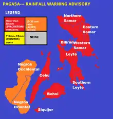 Shortly before Haiyan entered the Philippine Area of Responsibility on November 6, PAGASA raised Public Storm Warning Signal (PSWS) No.1, the lowest of four levels, for much of the Visayas and Mindanao.[34] As the storm continued to approach the country, warnings expanded into Luzon and increased in severity for eastern areas.[35] By the evening of November 7, PSWS No. 4, the highest level of warning which indicates winds in excess of 185 km/h (115 mph) are expected, was raised for Biliran Island, Eastern Samar, Leyte, Northern Cebu, Metro Cebu, Samar, and Southern Leyte.[36][37] Through November 8, the coverage of PSWS No. 4 continued to expand, with areas in southern Luzon being included.[38]