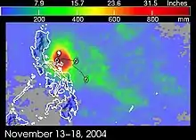 There was an area of extreme rainfall measuring possibly 40 inches (1,000 mm) just east off the coast of southern Luzon. Much of southern Luzon and other portions of central Philippines received rainfall between 10 and 20 inches (510 mm). Catanduanes and extreme southeastern Luzon might have been blanketed in as much as 35 inches (890 mm) of rain though.[12] Naga City only received a total of 8.26 inches (210 mm) of rainfall, but it was enough to flood some low-lying areas.[2] The highest 24-hour rainfall amount from the Philippines was 246.4 mm at Catanduanes between midday the 15th and 16th.[1] The passing of four cyclones in a short period of time as mentioned above caused a great deal of damage. Over 1,400 people either died or were missing, mostly from Winnie. Rainfall from all systems was extremely high.[3]