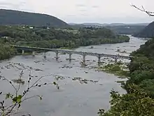 In August 1939, Maryland, West Virginia, and Virginia decided to instead embark on a tri-state road and bridge program to replace the destroyed bridge.[42] Plans for bridges across the Potomac and Shenandoah rivers and connecting highways were completed in August 1940.[43][44] The new bridge across the Potomac river was to be placed at Sandy Hook to exploit the scenic views of the Potomac Water Gap.[45] However, in December 1940, construction was delayed and plans needed to be modified to eliminate a sharp turn at the Virginia landing of the bridge.[46] Despite a late request from the Virginia State Highway Department to move the Potomac River crossing upstream in June 1941, the concrete substructure of the Sandy Hook bridge was started in autumn 1941.[47][48][49] The substructure was completed in March 1943.[50] A request for bids for the Sandy Hook bridge's steel superstructure was advertised in November 1941.[51] However, with the U.S. entering into World War II the following month, the construction of the superstructure of the bridge would be delayed until after the war due to the unavailability of steel.[47][52]
