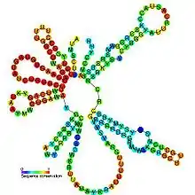 Although the sequence length of U2 snRNAs can vary by up to an order of magnitude across all eukaryotic organisms, all U2 snRNAs contain many phylogenetically constant regions particularly within the first 80 nucleotides downstream of the 5´ end where 85% of the positions are conserved.[16] Moreover, several secondary structural elements are also conserved including stem loops I, II, III, IV, and some of the single stranded regions linking these domains.[16][17] Stem loop II in yeast U2 snRNA, contains an unusual sheared GA base pair leading into a characteristic U-turn loop motif that shares a geometric conformation similar to that of tRNA anti-codon loops.[5] All U2 snRNAs possess a terminal stem loop (IV) with a 10-16 base pair helix and a conserved 11 nucleotide loop with the consensus sequence 5´-UYGCANUURYN-3´.[16]
