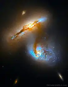 A tenuous bridge of gas, dust and stars can be seen connecting the two galaxies, created when they pulled material out into space across the diminishing divide between them.[2] Interaction between galaxies is not an uncommon event, however, two similarly sized ones merging is rare. The images released by NASA show both the galaxies distorting as they pulled closer. In the images, a thin bridge of gas, dust and stars can also be seen. The ridge was developed when the gap between both of the galaxies started diminishing.[3]