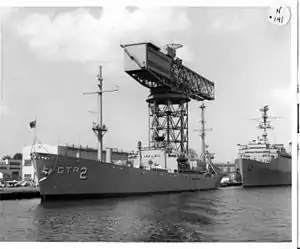 USS Georgetown (AGTR-2) moored pierside under the hammerhead crane at Norfolk Naval Shipyard, Portsmouth, VA. in October 1966