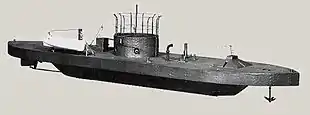 USS Monitor was an ironclad warship built for the Union Navy during the American Civil War and completed in early 1862, the first such ship commissioned by the Navy.[lower-alpha 1] Monitor played a central role in the Battle of Hampton Roads on 9 March under the command of Lieutenant John L. Worden, where she fought the casemate ironclad CSS Virginia (built on the hull of the scuttled steam frigate USS Merrimack) to a stalemate. The design of the ship was distinguished by its revolving turret, which was designed by American inventor Theodore Timby; it was quickly duplicated and established the monitor class and type of armored warship built for the American Navy over the next several decades.