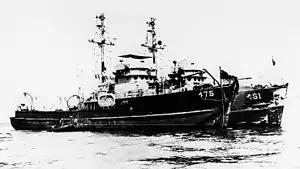 In October 1950, Swallow was part of a group consisting of Thompson (DMS-38), Carmick (DMS-33), Forrest Royal (DD-872), Catamount (LSD-17), Horace A. Bass (APD-124), Pelican (AMS-32), Gull (AMS-16), LST-Q-007, four Republic of Korea minesweepers, and a helicopter from Rochester (CA-124) that cleared the heavily mined port of Chinnampo in less than two weeks.[2]