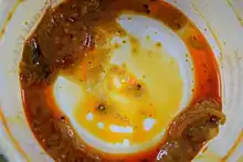 Uchchhishta (Sanskrit: उच्छिष्ट, Ucchiṣṭa), known by various regional terms, is an Indian and a Hindu concept related to food. Though the term has various meanings and has no exact parallel in English,[1] it is generally translated in English as "leftovers"[2] or "leavings",[3] but with a denigratory aspect. Uchchhishta frequently denotes food scraps after a person has eaten. In a broader sense, it refers to the contamination by food or hand that has come in contact with saliva or the inside of someone's mouth. A person or plate is also said to be Uchchhishta, when he/it comes in contact with Uchchhishta food.[2] Uchchhishta food as well as the Uchchhishta eater/utensil are considered ritually impure. The eater is purified by washing his hand (Hindus traditionally eat with their fingers) and mouth.