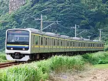 The Uchibō Line (内房線, Uchibō-sen) is a railway line operated by the East Japan Railway Company (JR East) adjacent to Tokyo Bay, paralleling the western (i.e., inner) shore of the Bōsō Peninsula. It connects Soga Station in the city of Chiba to Awa-Kamogawa Station in the city of Kamogawa, passing through the municipalities of Chiba, Ichihara, Sodegaura, Kisarazu, Kimitsu, Futtsu, Kyonan, Tateyama, and Minamibōsō. The line is connected at both ends to the Sotobō Line. The name of the Uchibō Line in the Japanese language is formed from two kanji characters. The first, 内, means "inner" and the second, 房 is the first character of the Bōsō. The name of the line thus refers to its location along the inner part of the Bōsō Peninsula in relation to the Tokyo Metropolitan Area, as opposed to the Sotobō Line, "outer Bōsō" which is on the opposite side of the peninsula. South of Kimitsu is single track, and north of Kimitsu is double track.