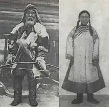 The upper summer clothing for men and women was kimono-cut cloth capchum robes with a left hem that was fastened on the right side. Ornaments on men's clothing were rare. Winter clothing was insulated (quilted on cotton wool). In winter, fur coats were also worn, cut like a robe and covered on top with cotton or silk fabric. Winter hats looked like a hood with a top made of white dog kamuses and a fox trim around the face. In severe frosts, a devil's fur earmuffs were worn under such a hat. In the summer they used birch bark hats. Shoes were made of fish , deer and elk leather ( rovduga ), seal and sea lion leather.