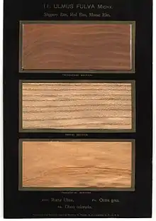 The timber is not of much importance commercially, and is not found anywhere in great quantity.[7] Macoun considered it more durable than that of the other elms,[27] and better suited for railway ties, fence-posts, and rails, while Pinchot recommended planting it in the Mississippi valley, as it grows fast in youth, and could be utilized for fence-posts when quite young, since the sapwood, if thoroughly dried, is quite as durable as the heartwood.[28] The wood is also used for the hubs of wagon wheels, as it is very shock resistant owing to the interlocking grain.[29] The wood, as 'red elm', is sometimes used to make bows for archery. The yoke of the Liberty Bell, a symbol of the independence of the United States, was made from slippery elm.