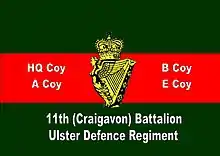 The Ulster Defence Regiment (UDR) was an infantry regiment of the British Army established in 1970, with a comparatively short existence ending in 1992. Raised through public appeal, newspaper and television advertisements,[1] their official role was the "defence of life or property in Northern Ireland against armed attack or sabotage" but unlike troops from Great Britain they were never used for "crowd control or riot duties in cities".[2][3][4] At the time the UDR was the largest infantry regiment in the British Army, formed with seven battalions plus another four added within two years.[5]