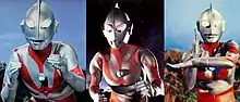 Writer Tetsuo Kinjo originally envisioned an intergalactic reptilian creature named Bemler to be the character that would become Ultraman. The creature could grow in size to 164 feet, with the design being a cross between Garuda and Tengu.[2][10] Ultraman's memorable design was done by Tohl Narita and clay sculptor Akira Sasaki, with the grey alien concept in mind.[4] Three Ultraman body suits were created for the show, all of which were based on the size of suit actor Bin Furuya. A lot of improvements to Ultraman's design were made during the series' progression. The first suit was known as Type A (episodes 1 to 13), followed by Type B (14–29) and finally Type C (30 and subsequent episodes).