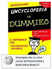 - "Uncyclopedia article about Wikipedia" (Wiki). Uncyclopedia. Retrieved July 31, 2010.