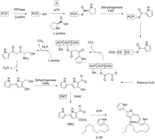 The biosynthesis of undecylprodigiosin starts with PCP apoprotein which is transformed into the holoprotein using acetyl CoA and PPtase then adenylation occurs utilizing L-proline and ATP. The resulting molecule is then oxidized by dehydrogenase enzyme. Elongation by decarboxylative condensation with malonyl CoA is followed by another decarboxylative condensation with L-serine using α-oxamine synthase (OAS) domain. The compound is then cyclized, oxidized with dehydrogenase and methylated with SAM to give 4-methoxy-2,2′-bipyrrole-5-carboxaldehyde (MBC) intermediate which react with 2-undecylpyrrole (2-UP) to give undecylprodigiosin.[2]