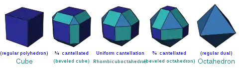 - t0,2 or rr: Cantellation - applied to polyhedra and higher. It can be seen as rectifying its rectification. A cantellation truncates both vertices and edges and replaces them with new facets. Cells are replaced by topologically expanded copies of themselves. (The term, coined by Johnson, is derived from the verb cant, like bevel, meaning to cut with a slanted face.)