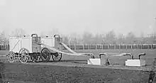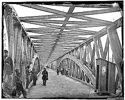 By 1 October 1861, the first balloon, the Union, was ready for action. Though it lacked a portable gas generator, it was called into immediate service.[20] It was gassed up in Washington and towed overnight to Lewinsville via Chain Bridge. The fully covered and trellised bridge required that the towing handlers crawl over the bridge beams and stringers to cross the upper Potomac River into Fairfax County. The balloon and crew arrived by daylight, exhausted from the nine-hour overnight ordeal, when a gale-force wind took the balloon away. It was later recovered, but not before Lowe, who was humiliated by the incident, went on a tirade about the delays in providing proper equipment.[21]