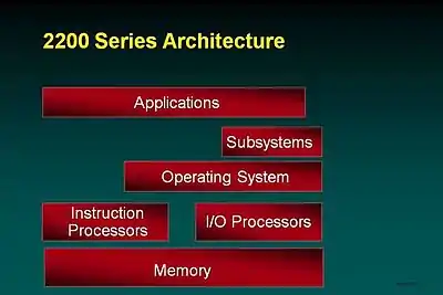 All I/O on 2200 Series systems is handled by I/O processors. These processors offload large portions of the I/O path length and recovery, and by fully isolating the main system from I/O faults, interrupts, bus errors, etc. greatly improve reliability and availability. The I/O processors come in three different types (Storage, Communications, Clustering) but the only real difference is the firmware load.[4]