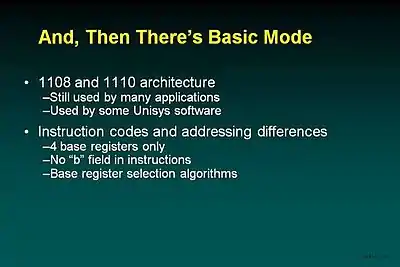 Basic mode is another whole form of instruction formats and addressing. Basic mode provides compatibility with previous systems back to the 1108. For all practical purposes, the hardware architecture defines the rules by which addresses and instructions are converted to the above forms. The most obvious difference in basic mode is the lack of explicit B registers in instructions. Instead there are four implicitly used B registers (B12-B15). There is a complex algorithm using the limits of the banks represented by those B registers, the operand address and the B register within which the current instruction is found.