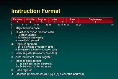 Typical instructions contain a function code, the target (or source) register, an index register, a base register and a displacement field. When the function code with its qualifier indicates immediate data, the displacement, base, i, and h fields combine to form a single 18-bit immediate value. This allows loading, adding, multiplying, etc. by small constants to eliminate a memory reference and the associated storage.