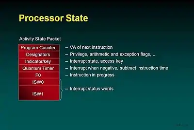 Processor state as captured on a stack at an interrupt contains the information needed to both return control to the interrupted activity and to determine the type of the interrupt. Interrupts may occur in the middle of long instructions and the state deals with that possibility.