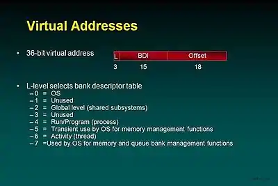 The Bank Descriptor Table Entry (Bank Descriptor – BD) gives the size of the bank (small = up to 256KW, large = up to 16MW, very large = up to 1GW). A small bank is always represented by a single BD. Large banks are represented by up to 64 consecutive BDs and a very large bank by up to 4096 BDs. Large and very large banks need not use all 64 or 4096 consecutive BDs. They only use as many as needed to provide the virtual address space required. The entry also contains upper and lower limits of allowable offsets within the bank. Virtual addresses that are outside the limits generate a fault interrupt. This allows small banks, for example containing a message, to have only the virtual space reserved for it that it actually needs and provides a debugging check against bad pointers and indices.