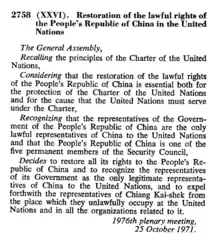 - United Nations General Assembly Session 26 Resolution 2758. Restoration of the lawful rights of the People's Republic of China in the United Nations A/RES/2758(XXVI) page 1. 25 October 1971. Retrieved 7 October 2008.