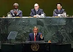 - United Nations General Assembly Session 57 Verbatim report 2. A/57/PV.2 page 6. President George W. Bush United States 12 September 2002 at 10:00. Retrieved 7 July 2015.