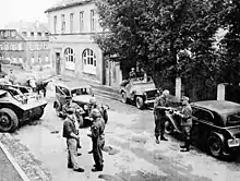 The primary unit of the Constabulary, the troop, was organized on the pattern of the mechanized cavalry troop used in the war. In view of its tasks of road and border patrolling and its police-type jobs, the Constabulary needed a greater number of hand weapons and light vehicles, such as jeeps and armored cars. Each troop was divided for patrolling purposes into sections or teams, each of which was equipped with three jeeps and one armored car serving as a command vehicle and as support in case of emergency. A mobile reserve of one company equipped with light tanks was established in each Constabulary regiment. Horses were provided for patrolling in difficult terrain along the borders and motorcycles for the control of traffic on the super-highways (Autobahnen). Static border control posts were established at the crossing points.[1]