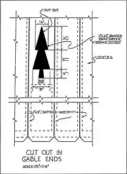 - A second residence (building #1052) was built by the Civilian Conservation Corps at the John Day Experiment Station sometime between 1936 and 1938. It was moved to the ranger station in 1953. It is an L-shaped, 1+1⁄2-story wood-frame structure on a concrete foundation. It has a high gabled roof with larger gabled dormers on the south side (rear) of the structure. There is a large offset gable on the northeast corner and shed-type roof over the front porch which is located on the north side of the building. The porch roof is supported by round peeled-log posts. There is a brick chimney on the south side of the house and a concrete chimney on the north side. The exterior siding is horizontal clapboard with wooden corner trim and vertical board and batten siding at the gable ends. The residence has six-over-six double-hung sash windows. There are decorative pine tree logo cut outs just below the peak on the north, east, and west gable ends of the building.[4]