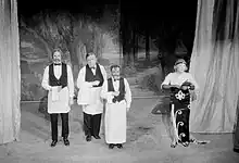 The company was notable for pioneering new dramatic forms, such as company-devised documentary pieces, 'Living Newspapers' and satirical pantomimes, including Babes in the Wood (whose cast included Bill Owen, Mark Cheney, Vida Hope, Alfie Bass and Una Brandon-Jones).[5] Ann Davies appeared as Robin Hood (the Principal Boy) in a political version of the pantomime Babes in the Wood which lampooned Neville Chamberlain's appeasement policy and had her as saviour in a Russian uniform. The production ran for seven months and Montagu Slater credited the play with making real political change.[6]