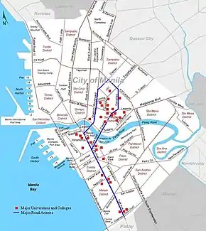 The University Belt is the name of a de facto subdistrict in Manila, Philippines. It refers to the area where there is a high concentration of colleges and universities in the city.[1] The districts of Quiapo, Sampaloc, and San Miguel are traditionally considered to be the University Belt,[2] although other clusters of schools that lie along the southern bank of the Pasig River, mostly at the districts of Intramuros and Ermita, as well as the southernmost part of Malate near the city limits are also sometimes included.[3] Each of the colleges and universities found in the district are a short walking distance of each other.
