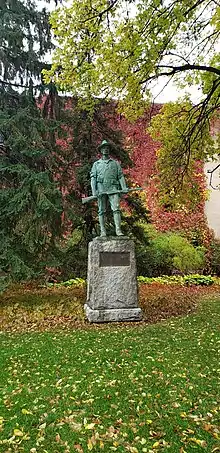 Outside the Armory building, there is a nine foot tall statue of a soldier on a seven-ton, six-foot-high Vermont granite pedestal. It is called "Iron Mike" and a memorial plaque underneath reads: "erected in honor of the students of the University who served their country in the war with Spain, 1898-99.” Sculptor Theo Alice Ruggles Kitson designed the statue, which was commissioned and paid for by a committee that had originally been formed to send Christmas gifts to student soldiers in the 13th Minnesota Regiment, who were stationed in Manila. Professor Arthur E. Haynes, who chaired this committee, suggested doing something more than just sending gifts. He donated the first ten dollars and led the fundraising and process of designing the statue. It was unveiled in 1906.