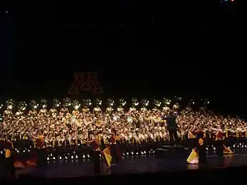 The University of Minnesota Marching Band (also known as UMMB, Minnesota Marching Band, and The Pride of Minnesota[1]) is the marching band of the University of Minnesota and the flagship university band for the state of Minnesota. The Pride of Minnesota serves as an ambassador for the university, representing the school at major events both on and off campus.[2] The band performs before, during, and after all home Golden Gopher football games and bowl games, occasional away games, local parades, numerous pepfests, exhibition performances,[3] as well as a series of indoor concerts at the end of the regular football season.[3] Members of the band, along with non-member students, also participate in smaller athletic pep bands that perform at other major sporting events, including men's hockey, men's basketball, women's hockey, women's basketball, and women's volleyball.[4]
