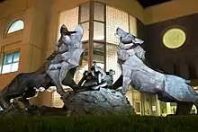 Sculpture of Los Lobos de Loyola in front of Gleeson Library