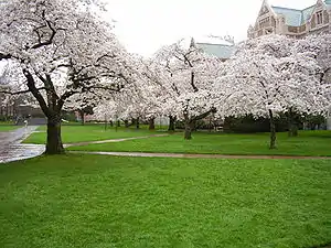 The quad is lined with thirty Yoshino cherry trees, which draw sightseers when they blossom, typically between mid-March and early April.[1] The cherry trees were bought by the UW in 1939 and initially planted at the Washington Park Arboretum.[4][5] The trees were moved onto the campus's Liberal Arts Quad in 1962 after construction began on State Route 520, which cut across part of the arboretum.[6] In 2014, an additional 32 trees were donated with funds from the Japan Commerce Association and will be planted at Rainier Vista and in the arboretum.[7]
